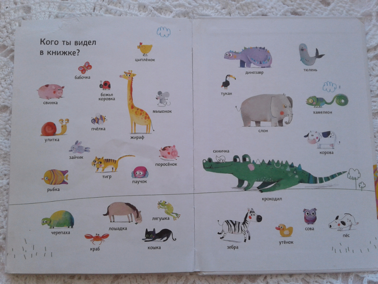 С полутора лет младшая дочь обожает эту книгу. Она показывает пальцем на животного, я называю, а дочка то прыгает как лягушка, то скачет как зайка, то пищит как мышка, то мычит как корова. У нее даже есть любимые персонажи: кошечка, зайчик, паучок, хамелеон, поросенок и слон)