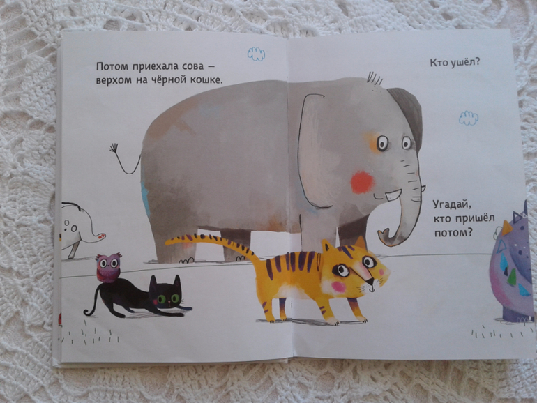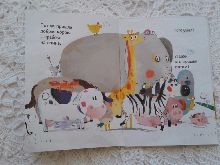 Идея книги проста и гениальна! На каждой страничке уходит один зверь, а приходит два новых животных. Отличная возможность тренировать память и внимание малыша!!!