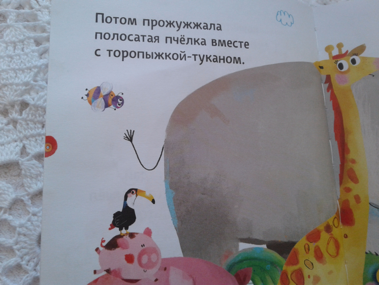Еще в книге есть второй игровой момент. Авторы называют его развитием логики, по-моему развитие зрительного восприятия. Суть: на краю страницы есть часть изображения животного, которое ушло и придет. Ребенок должен достроить визуальный образ.