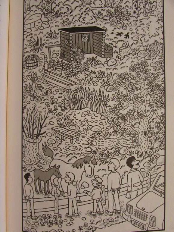 А правильные ответы опубликованы на следующем развороте. Поэтому каждый разворот книги содержит часть истории с загадкой и рисунок, на котором надо найти ответ на загадку. Количество загадок в каждой повести разное. Например: в 1 повести их 16, во второй - 14, в последней - 17.