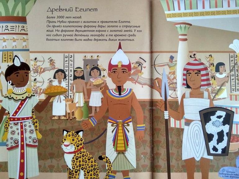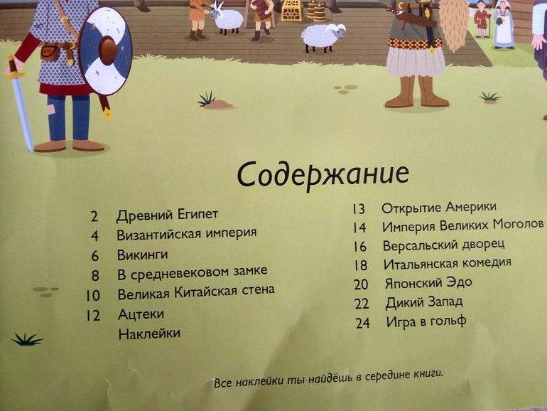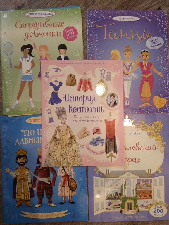 По возрасту (4,5-5лет) оказалась книга "Что носили давным давно". Делали ее вместе, читали о времени, когда это было, смотрели на карте, где это было (на каком континенте, в какой стороне света). Наклейки отделяются от основы хорошо, есть названия элементов одежды, для каждого персонажа на листе с наклейками соответствует свое цветное обозначение, порядковая нумерация элементов одежды (одевать строго а соответствии, чтобы не получились рубашки поверх доспехов,например), по стрелочкам переходим к одного элемента к другому (костюмы не перепутать). Единственный минус для нас оказался: не отделяются названия в одежде: мы вырезали сами и приклеивали рядом. Мы и сейчас не рассматриваем и читаем.