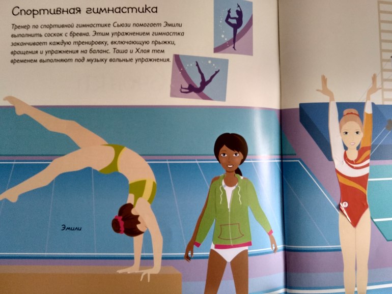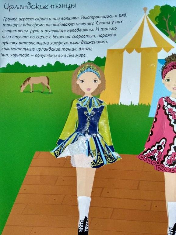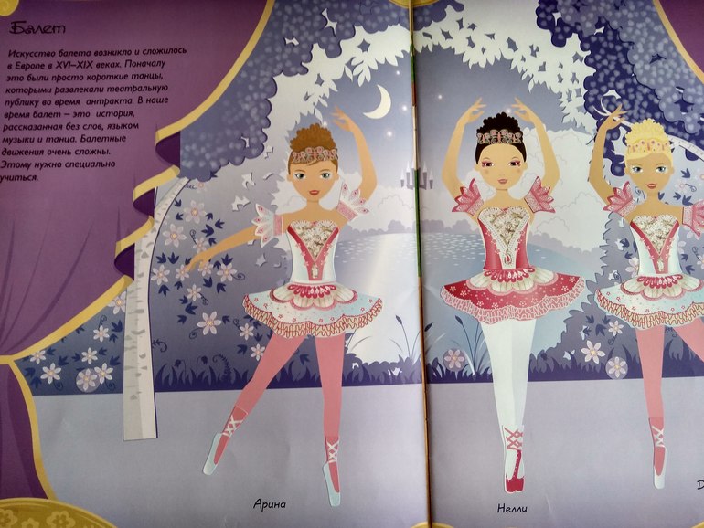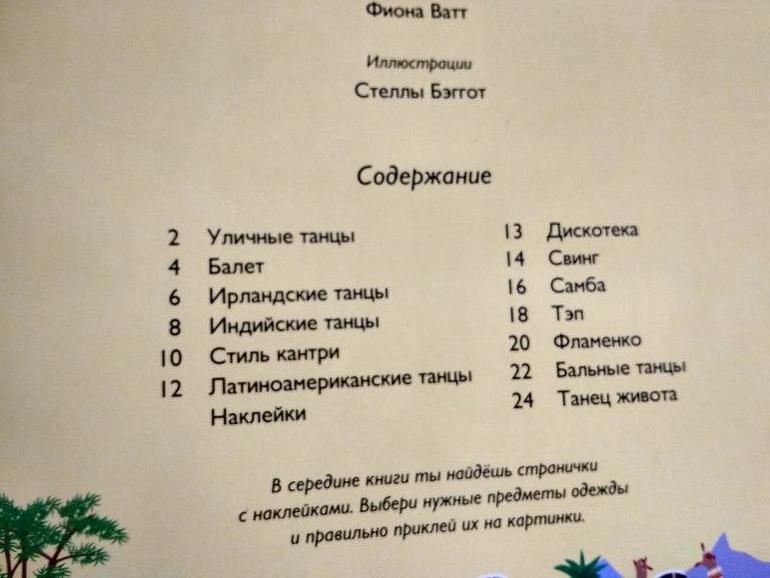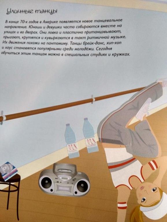 А вот эти две книги уступают и по качеству (наклейки сложно переклеивать, если наклеили неверно, рвутся), нет стрелок и названий элементов одежды (например, гимнастический купальник, пачка и т.д.). Ребенок сам, ориентируясь на номера страниц, все расклеил за три раза по полтора часа). После смотрели по интернету стили танца, виды спорта. Попробовали и сами повторить африканские танцы (их элементы в уличных танцах, как мы узнали).