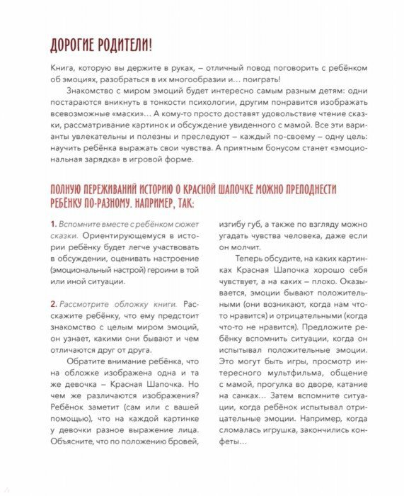 Эта книга - отличный повод поговорить с детьми об эмоциях, разобраться в их многообразии и, конечно, поиграть! Рассматривая иллюстрации и обсуждая чувства Красной Шапочки, ваш ребёнок станет настоящим следопытом в запутанном мире эмоций. Он научится не только выражать свои чувства, но и различать эмоции и узнавать их «в лицо», и в результате лучше понимать других людей.