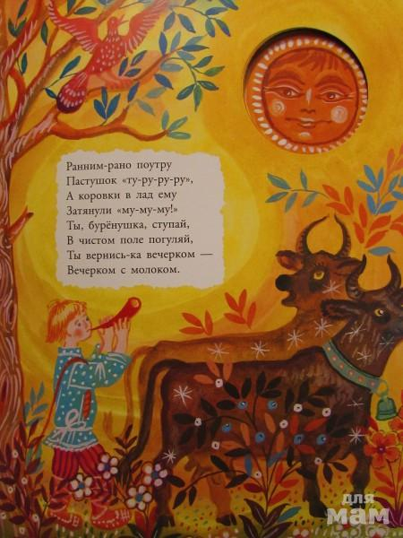 На дневных страницах в окошко заглядывает солнышко - птички поют, пастушок гонит коров на пастбище, детки просыпаются, умываются и радуются новому дню.
