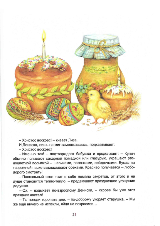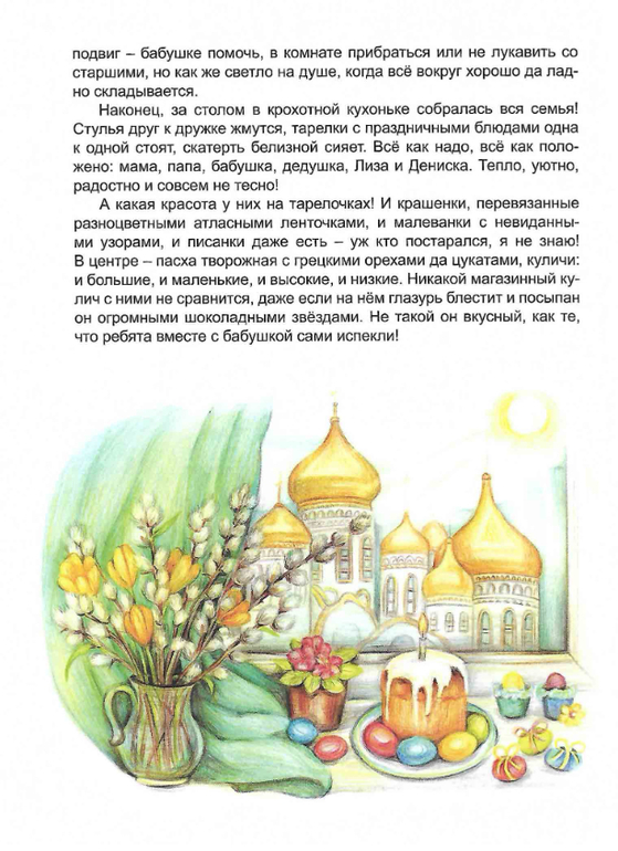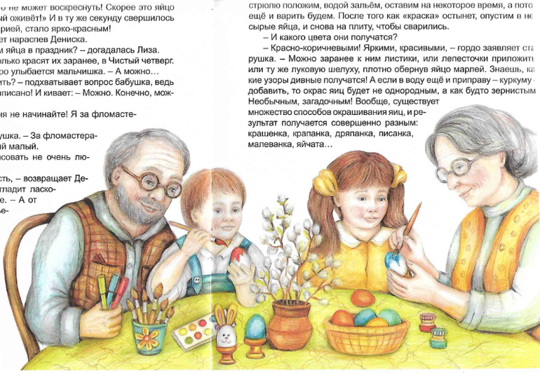 Вот и детки,Лиза и Дениска,не знали.Да хорошо,что у них бабушка есть,которая всё-всё им рассказала.А ещё про подготовку к самой Пасхе.И про Чистый четверг,когда принято не только внешнюю чистоту наводить,но и в мыслях прибраться.Постараться настроить сердце своё на добро.И про праздничный пасхальный хлеб и творожную пасху.И про традицию красить яйца.