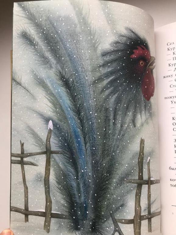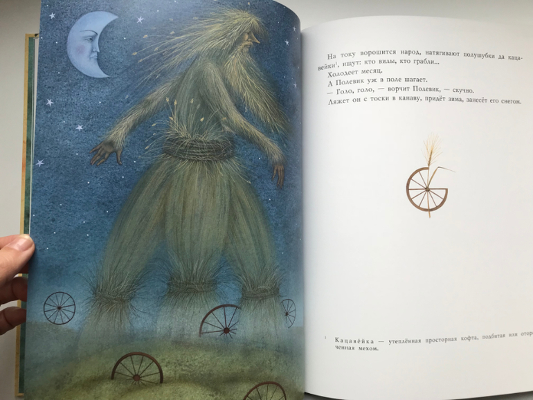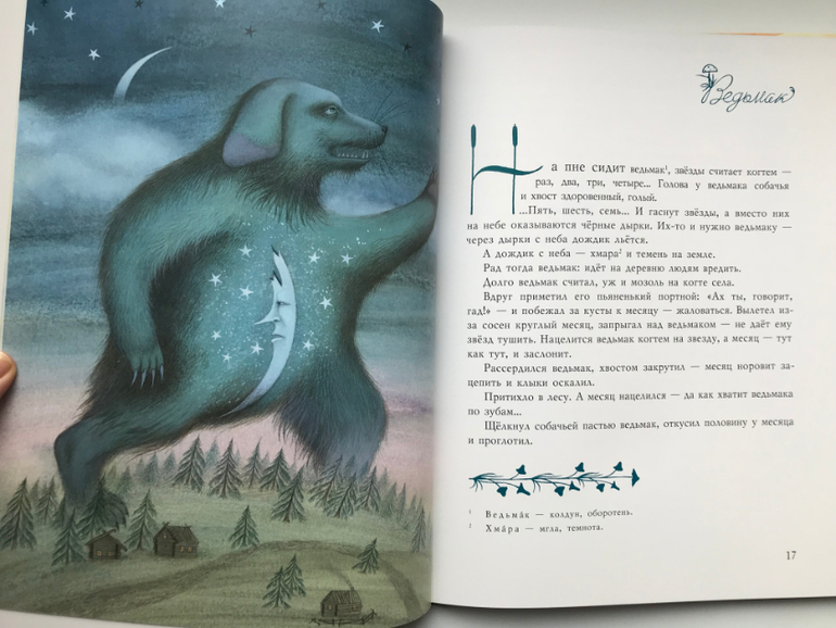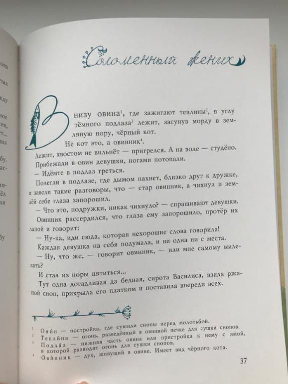Обложка с выпуклыми элементами на рисунке, в приятной цветовой гамме. Сама книга большого формата, с мелованной плотной бумагой,шрифт крупный, рисунки на целую страницу, красивое оформление заглавных букв, названий рассказов и самое что интересное ,ссылки указаны внизу текста , а не в конце книги, что делает очень удобно при прочтении объяснить ребенку , что это обозначает.