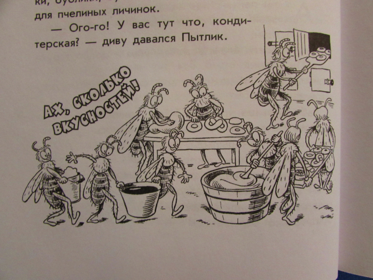 Вот только - только Пытлик помогал пчёлам. Поливал в пчелином улье коридорчики, а вот он уже «чертит» жукам - дровосекам домик для пани Дровосековой.