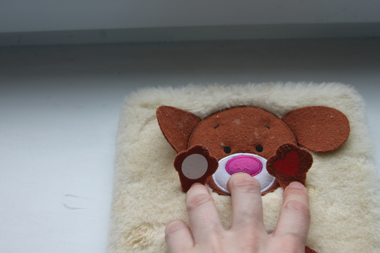 Книжка эта была подарена нам в далеком 2009 году, когда родилась моя доченька. Танюшка эту книгу тискала, водила по ней пальчиками, тянула за концы, гладила ладошкой. На светлом пушистике часто оставались пятна от детских ручек. Теперь 2018 год и опять на книжке пятна, и опять от детских ручек. Эта книжка приятная на ощупь, прочная, собачка из мягкого фетра. Лапки приподнимаются, носик и глазки выпуклые. Ванечка любит приподнимать лапки и смотреть, что же там спряталось)))