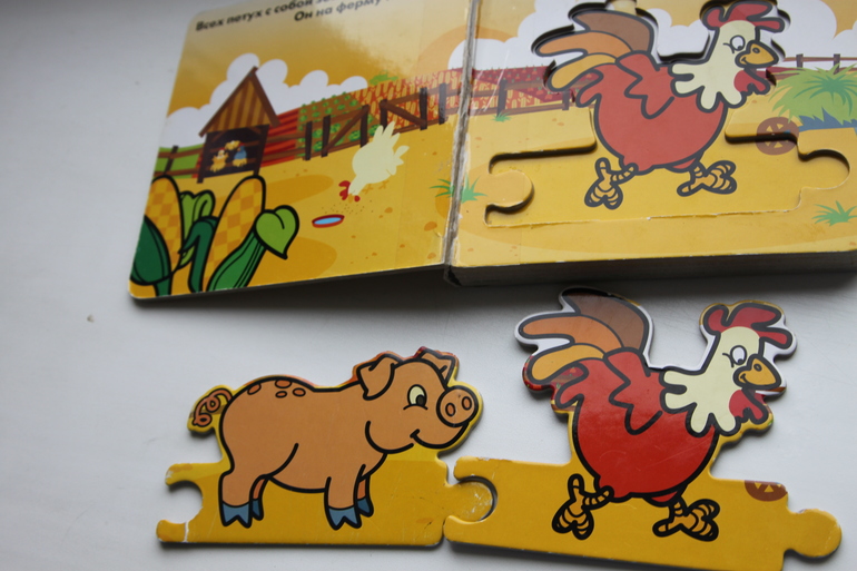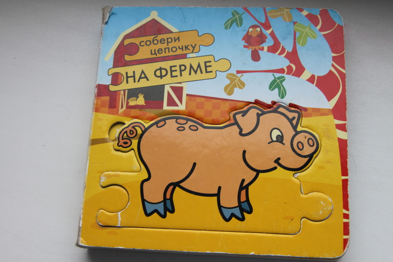 Досталась младшему от старшей. Издана была в 2006 году Мозаикой - Синтез. Это книга - пазл, можно играть, собирая цепочку, а также повторяя кто, как кричит. Нам эта книга нужна и важна. Ребенок должен учиться воспроизводить звуки, начиная с элементарных. И также тренируем слух и понимание речи. Например, я говорю, дай коровку - мууу, сынок дает, и вместе строим цепочку.