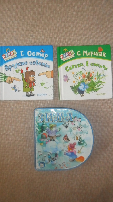 Ну и вот такие 3 книги нам от знакомых перепало. Книгу про зиму смотрит иногда, Маршак не интересен, а вот "Вредные советы" в качестве картинок таскает мне часто