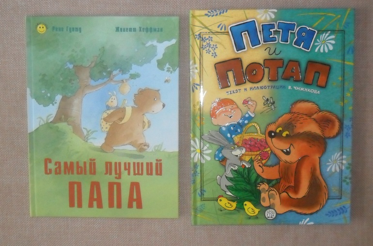 "Самый лучший папа" купила, чтоб было приятно мужу)) "Петя и Потап" потому что сын Петя и иллюстации Чижикова люблю. Пару раз вместе полистали, убрала лет до двух, жалко пока такие красивые книги отдавать на растерзание.
