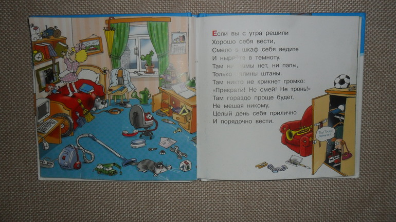 Любимый разворот для рассматривания. Тут и машина с краном, и трактор, и кота пылесососм так смешно засасывает. Но текст, конечно, не для малышей)