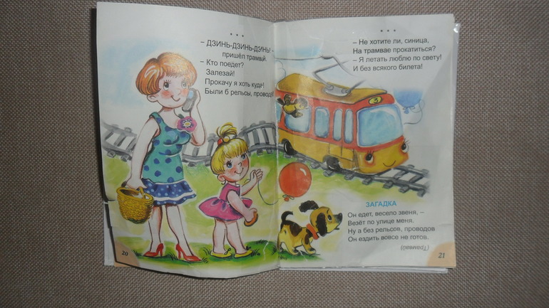 Он мне недели 2 каждый день приносил и просил найти трамвай. Позже стали интересны и другие странички, к сегодняшнему дню прочитали все стихи, много выучили животных по ней.
