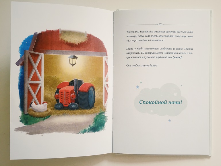 Визуально книга сделана очень хорошо. Приятная на ощупь обложка и очень милые иллюстрации. Сначала мы с сыном долго их рассматривали. В это время он не спал. Я дала ему "поиграться" с книгой заранее. А потом, когда они ему уже приелись и перестали вызывать бурю восторженных эмоций, я просто стала читать сказку, следуя всем инструкциям. В силу возраста (1,5 года), первое время сын никак не мог дослушать сказку до конца и старался куда-то убежать. Но постепенно он привык и стал слушать спокойней и дольше. Обычно я читаю ему несколько страниц, глажу, потом обнимаю и, расслабившись, он постепенно засыпает. Пока что он ни разу не уснул во время чтения книги, но она помогает ему расслабиться и успокоиться. Я думаю, когда он станет постарше и сможет уже лежать один и спокойно слушать сказки, книга поможет ему не только стать спокойней, но и окончательно уснуть. По крайней мере, про себя могу сказать, что, читая с нужной интонацией, вовремя зевая и растягивая некоторые слова, сама я еле как пытаюсь контролировать себя, чтобы не заснуть. :)