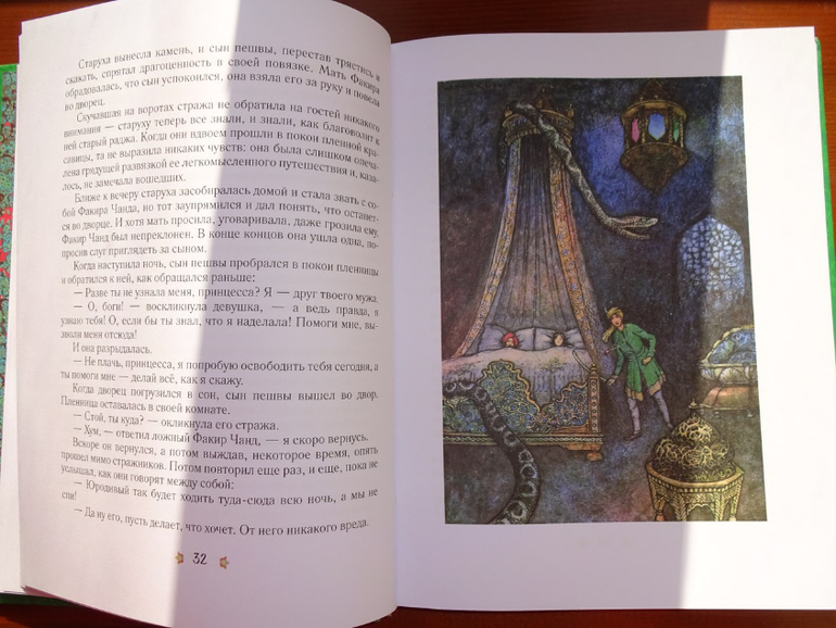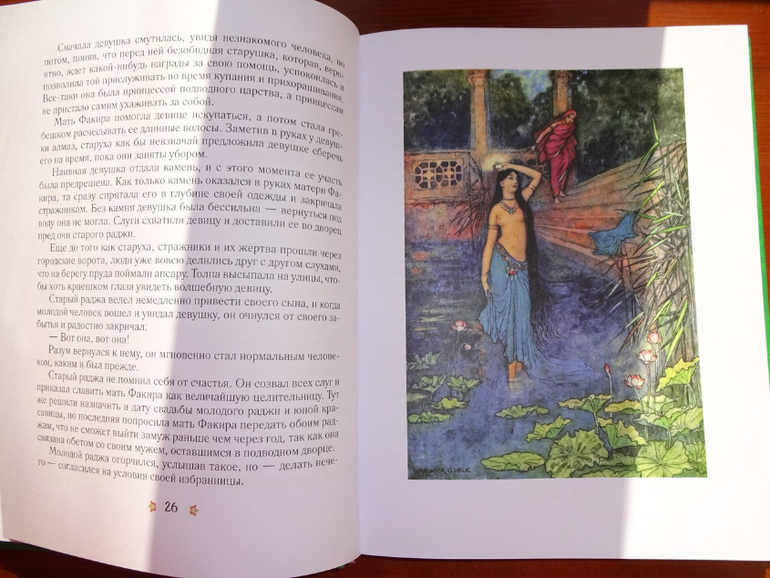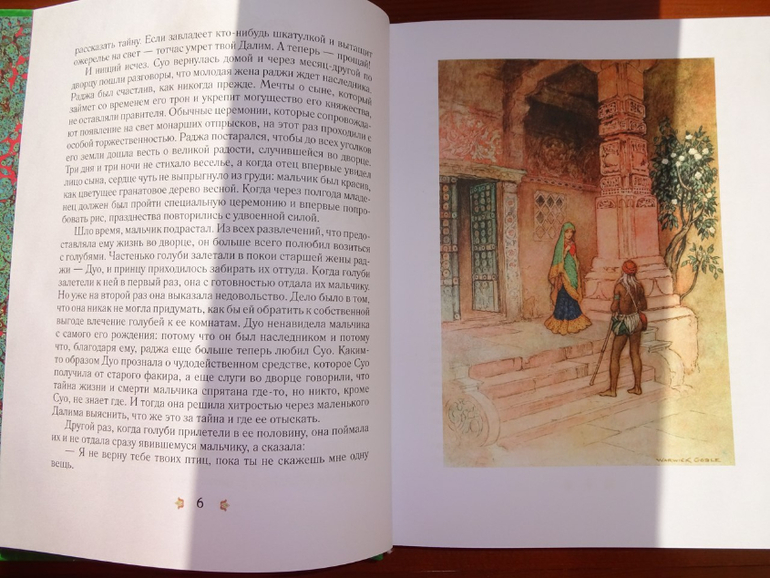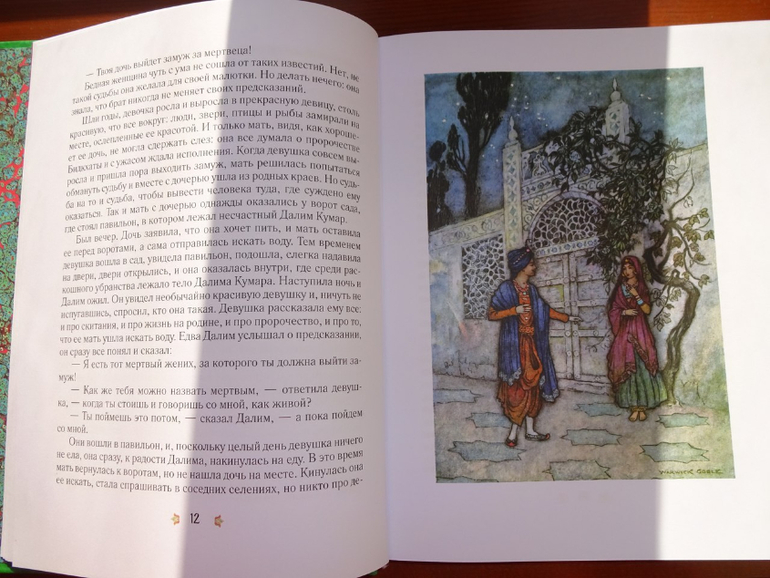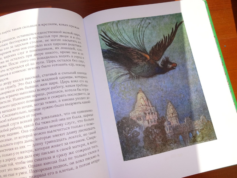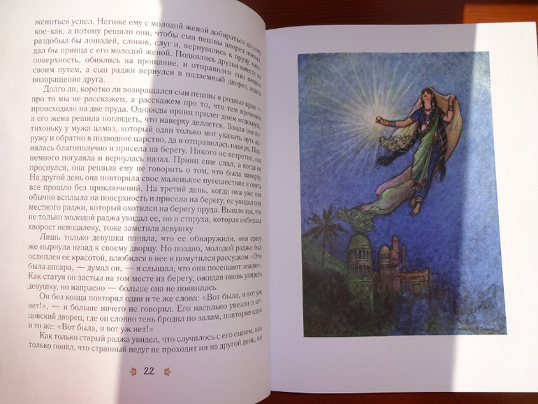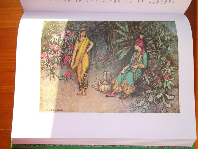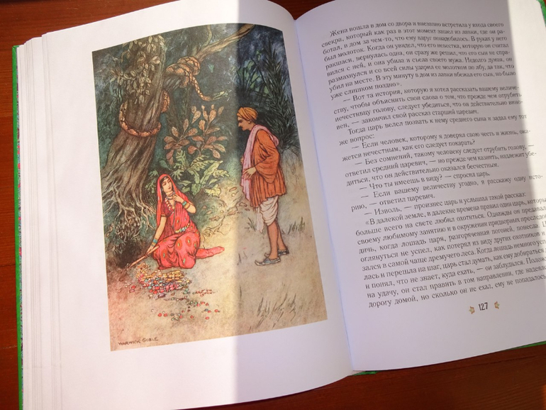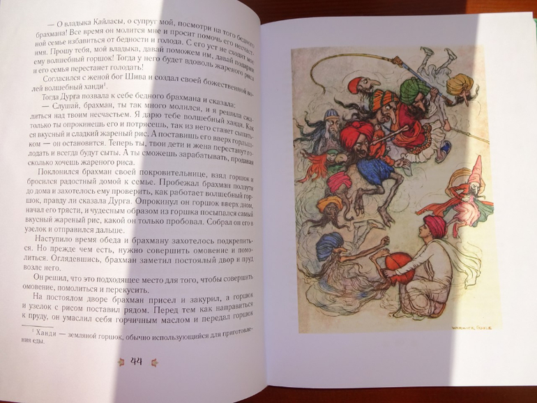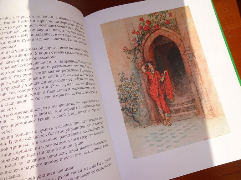 Насчитала 32 полосных иллюстрации довольно неплохого качества. У "Книговека" они немного крупнее, учитывая, что и сам формат издания больше. Некоторые, пожалуй, несколько темноваты, но цвета в целом выглядят насыщеннее, чем у ИДМ, не такие прозрачные и, главное, гораздо теплее, что в большей степени подходит красочному миру индийского фольклора.