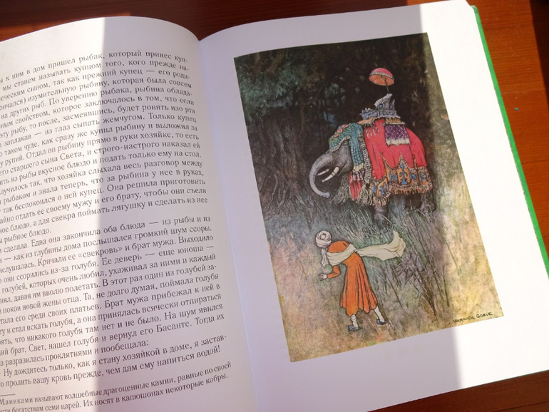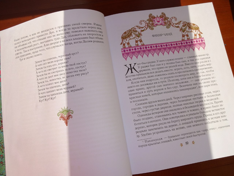 Честно говоря, я лично не имею ничего против "засиженных мухами страниц", как выразился один из рецензентов, мне нравится формат МКСИ, но противопоставление двух разных изданий напрашивается само собой - у "Книговека" использован белоснежный офсет и в целом оформление почти лаконичное, если бы не заставочные иллюстрации с золотыми слонами. Они сразу отсылают нас к стране происхождения сказок.