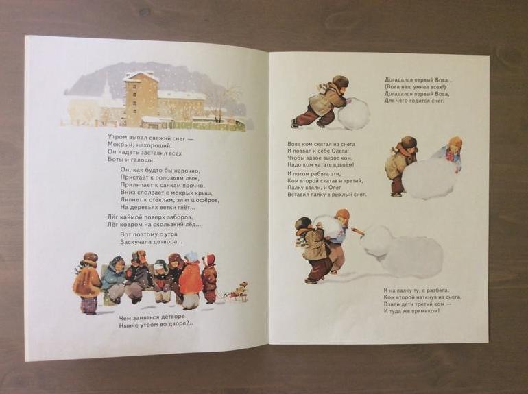 Далее речь пойдёт о зимне-новогоднем чтении. Тонкие книжки на скрепке от Речи со стихотворениями про зиму. Читали очень часто и с большим удовольствием. Так как это была первая «ходячая» зима для сына, то лепили снеговиков, снежки, катались на санках, и с интересом читали обо всем этом в книжках. Искренне советую прочитать их. Ниже на фотографиях по одному развороту из каждой книги.