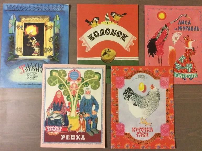 Очень понравилась книга «Рукавичка» с иллюстрациями Е.М. Рачева. Книга про Колобка с его же иллюстрациями одна из любимых у сына. Илюша сразу заметил сходство с Теремком и притащил коробку с деревянными фигурками по сказке Теремок от Томика.