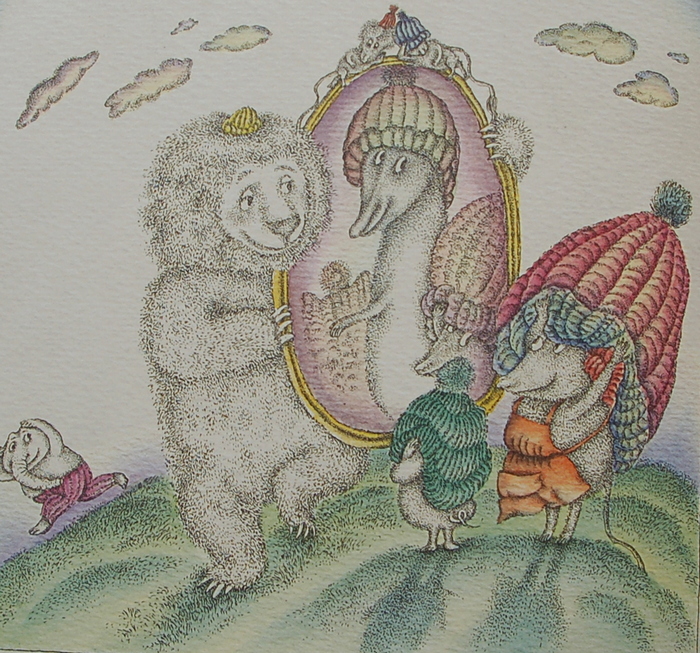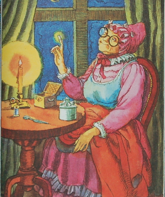 Портниха Бориса Диодорова, разыскавшая свой железный наперсток и вновь надевшая его на палец, словно рыцарь свой шлем перед боем ("Волшебная шубейка")