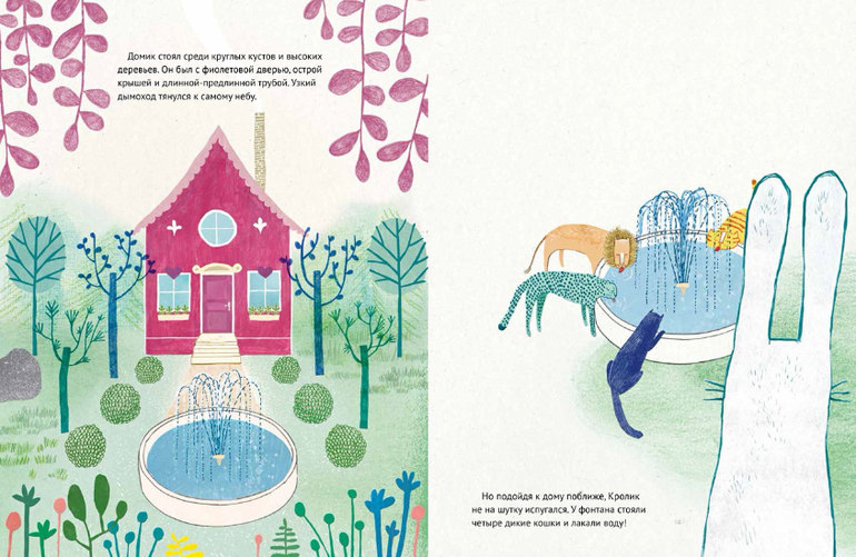Кролик купил себе летний домик и отправился в отпуск. Однако возле домика он обнаружил четырех диких кошек, которые лакали воду из фонтана! Кролик страшно перепугался. Что же делать?