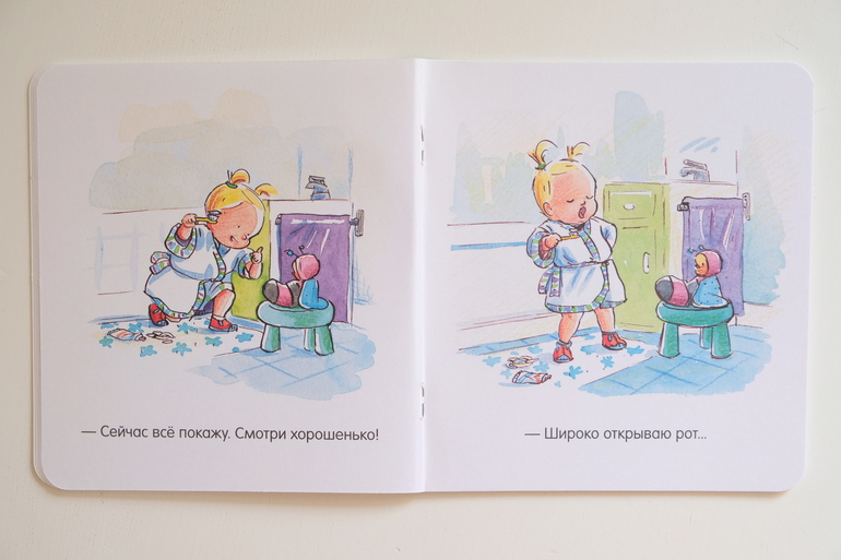 Книжки по размеру очень маленькие, лёгкие. Страницы плотные. Опять хочу обратить внимание на то, что ребёнку легко их держать в руках и самостоятельно листать. Это действительно важно, если вы хотите, чтобы книжки прожили более менее долго, и ваш малыш при этом «читал» их сам.