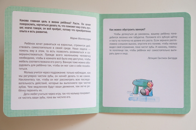 Как утверждают различные педагоги и психологи, ребёнку всегда проще обучаться чему-либо через игру, а не просто слушая от родителей наставления, сухой текст или, что ещё хуже, нравоучения. И рассказы про Полину и Жужу помогают ребёнку через интересных ему героев обучиться самым важным, рутинным и бытовым навыкам, которые порой родителям так сложно объяснить. Эти коротенькие истории могут стать прекрасным поводом для разговора с ребёнком о распорядке дня, а советы монтессори-педагога помогут родителям правильно организовать пространство для малыша и найти идеи для совместных занятий.
