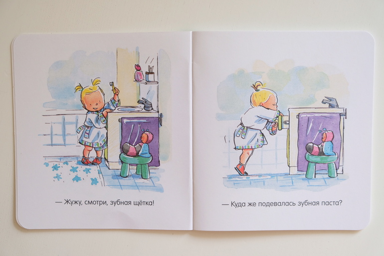 Например, вот история о том, как Полина учит Жужу чистить зубы. Озорная малышка идёт в ванную, достаёт зубную щётку, пасту и показывает своей кукле, как правильно чистить зубы. Все это сопровождается забавными проказами, присущими деткам такого возраста. Но в целом Полина очень самостоятельная и с легкостью может справиться с таким обычным занятием, как чистка зубов. Маленькие детки очень любят учить других тому, что умеют сами. И Полина, как любой ребёнок ее возраста, с радостью это делает.