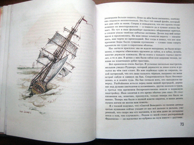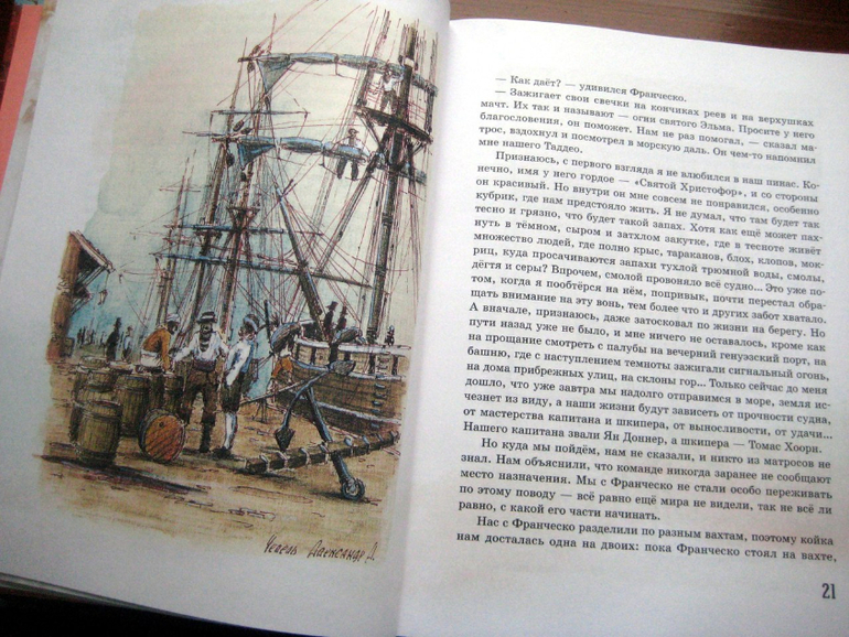 Вообще роман очень напоминает "Великое плавание" Зинаиды Шишовой, который я буквально на днях читала: здесь главные герои - двое мальчишек-итальянцев и там тоже. Только происходящее в "Великом плавании" привязано к конкретным историческим событиям и имени - Христофор Колумб, а здесь сопровождается всякими мистическими образами типа морской девы и таинственными происшествиями: например, когда шестеро спасшихся после захвата пиратами "Святого Христофора" матросов вновь встретили свой бывший корабль, они увидели странную картину - корабль был пуст: