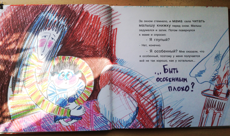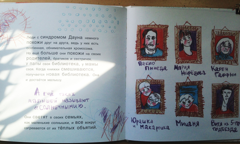 Это очень искренняя и добрая книга, тёплая и ласковая, как солнышко. И не случайно на фотографии разворотов прыгнул солнечный лучик :)