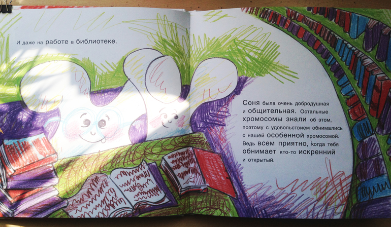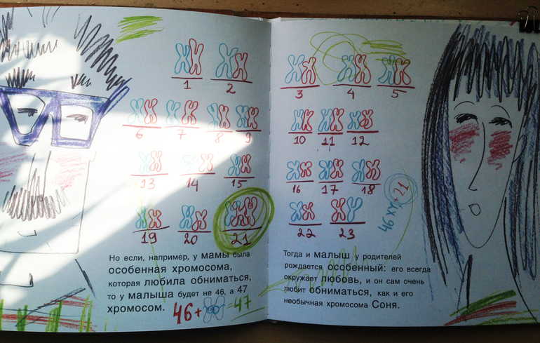 Однажды над городом, где жили хромосомы, раздался вой сирены. 23 хромосомы собрали рюкзаки со своими любимыми книгами и заняли места напротив 23-х лифтов. Но хромосома Соня немного замечталась, она не услышала сирену - в этот момент она обнимала другую, 21-ю хромосому. Поэтому когда открылись лифты с другими такими же хромосомами, 21-я хромосома из лифта растерялась - её ждал не один, а сразу два друга... но обрадовалась: втроём будет гораздо интереснее! Вот так и родился особенный малыш, который так же, как и Соня, любит обниматься.