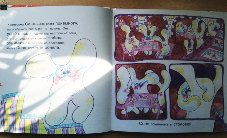 младшим школьникамКнига "ХромоСоня" - особенная, как и сама её героиня - хромосома Соня, которая очень любила обниматься.