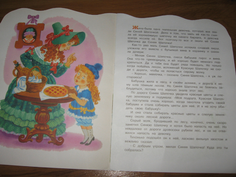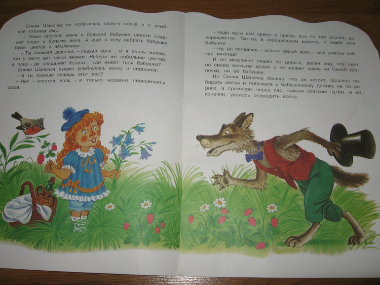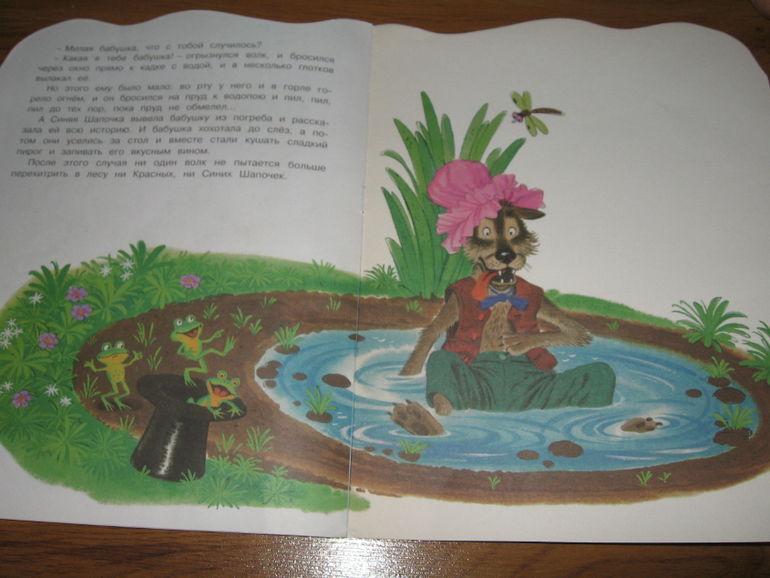 Это новое прочтение Красной Шапочки) Тут волк никого съесть не успевает, брюхо ему никто в конце не вспарывает, а за свое вероломство он наказан бутербродом с горчицей, перцем и солью. В целом все хорошо, но... есть пара моментов, которые пришлось редактировать. Во-первых, Шапочка несла бабушке пирог и вино, вот это самое вино по тесту я заменяла на бутылочку масла. Во-вторых, в конце сказки, празднуя победу, бабуля с внучкой, кушали пирог и "запивали его вкусным вином". Тут уж пришлось читать вкусным соком)))