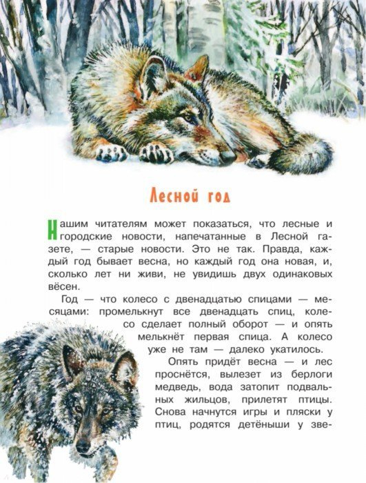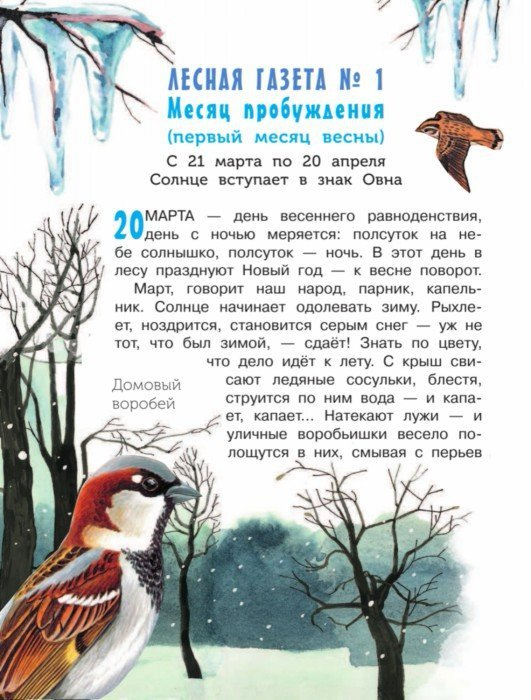 "Опять придёт весна - и лес проснётся, вылезет из берлоги медведь, вода затопит подвальных жильцов, прилетят птицы. Снова начнутся игры и пляски у птиц, родятся детёныши у зверей. И в Лесной газете читатель найдёт все свежие лесные новости..."