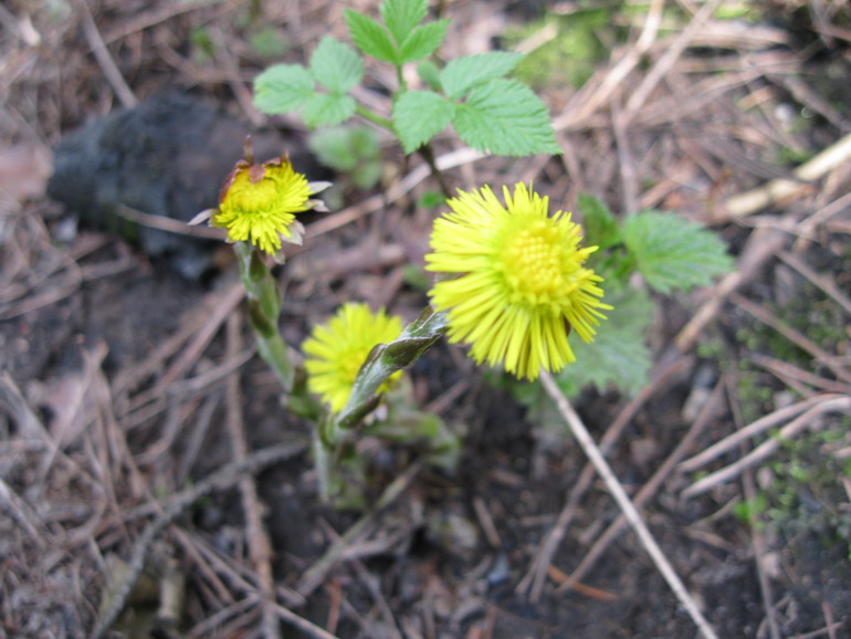 У самой дороги нашлись маленькие солнышки мать-и-мачехи...