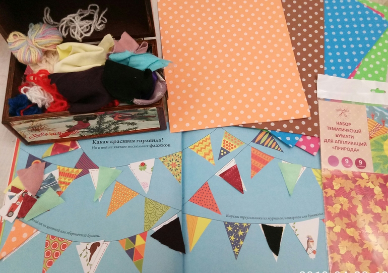 Делаем флажки из разных видов и текстур ткани, бумаги, фольги, и отличное упражнение для пальчиков обеспечено)