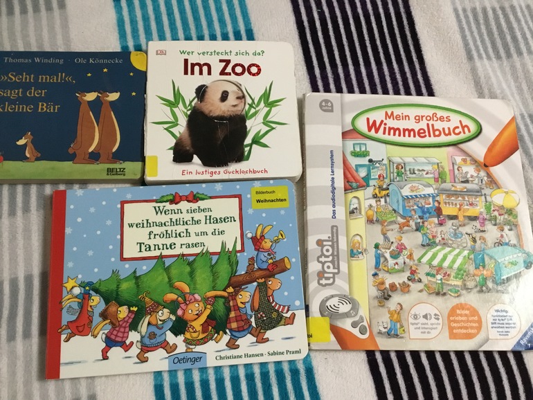 7. Событием месяца стала наша запись в местную немецкую библиотеку. Перед закрытием успели взять эти четыре. Для немецкого очень кстати простые и малышковые книги и виммельбух для ТипТои ручки.