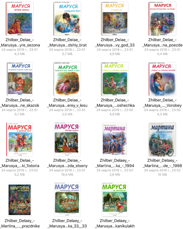 1. Перечитали все найденные книги Жильбер Делаэ из серии Маруся или она же Мартина. Не знаю, как описать мой личный восторг этих книг, художественная эстетика Марселя Марлье, эти детские мордашки, французские пейзажи, картинки просто живые и эмоциональные, нельзя не влюбиться, истории такие насыщенные жизнью, интересной детской жизнью. Дочка по картинкам копирует ПАа балерин. Оба слушали очень внимательно и заказывали мне по 3-5 книг с пересчитыванием на пальцах, а не меньше ли мама прочитала. Теперь хочу каким-то путём заказать новые три сборника Маруси по 8 книг в каждой. Нахожу интересными не только для девочек, но и для мальчиков, почему бы не иметь образец той самой девочки-девушки в будущем, по критериям которой стоит выбирать себе жену;) Но а электронно я нашла ещё 5книг, которые перейдут в майский список.