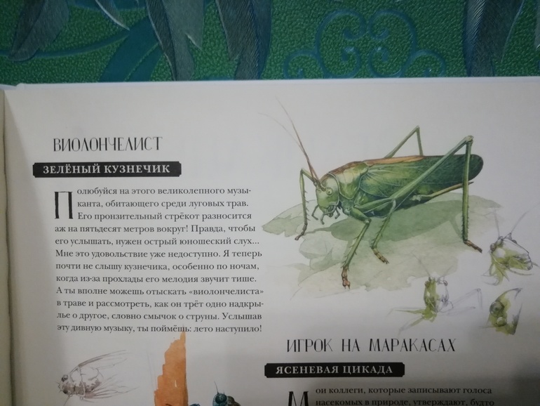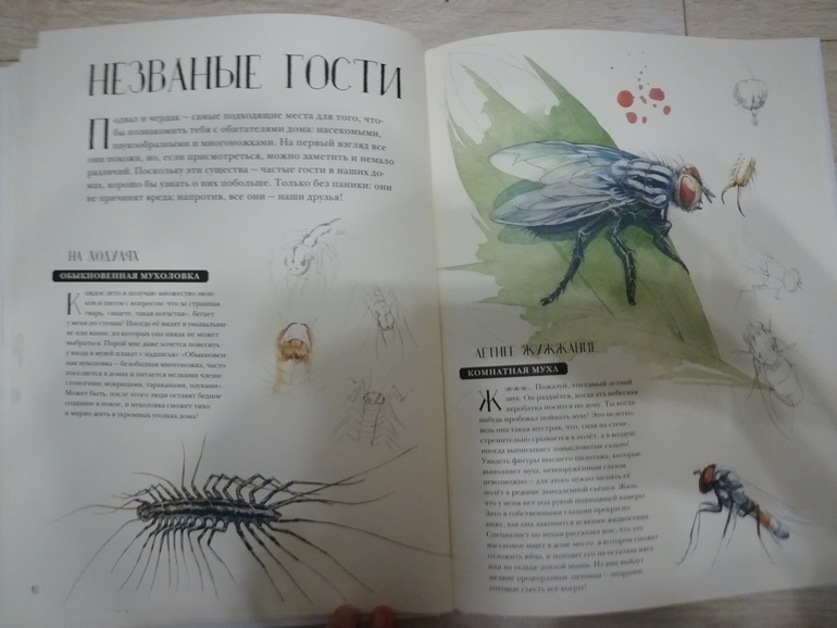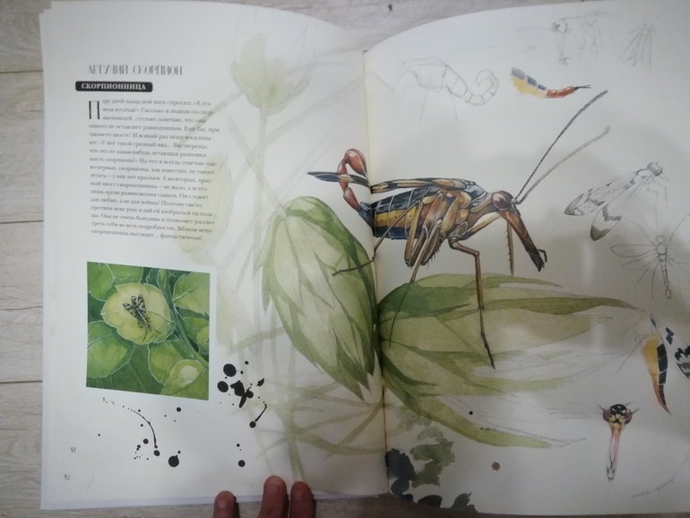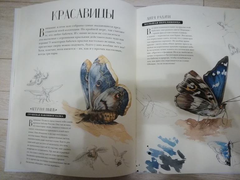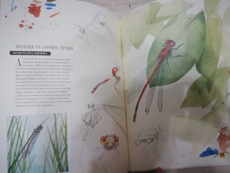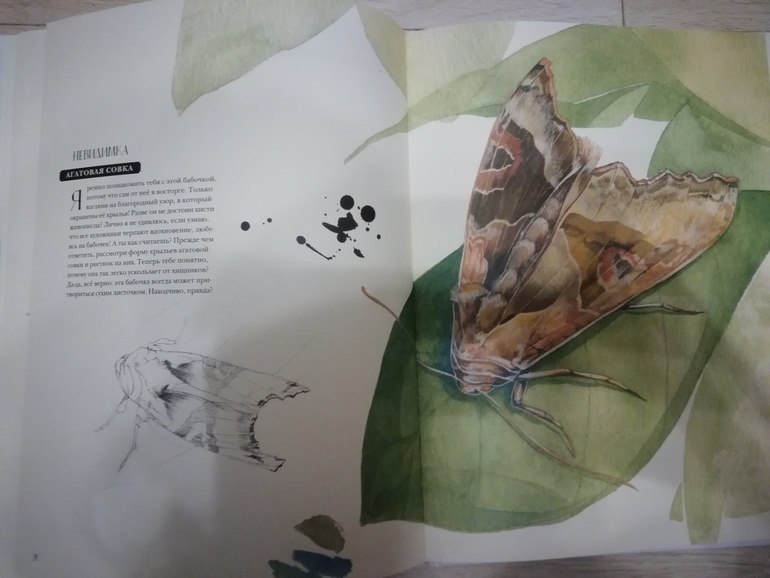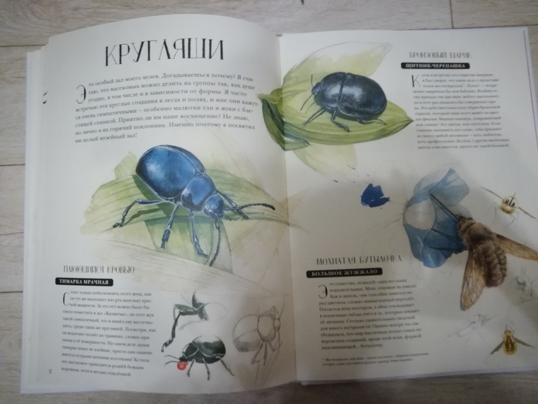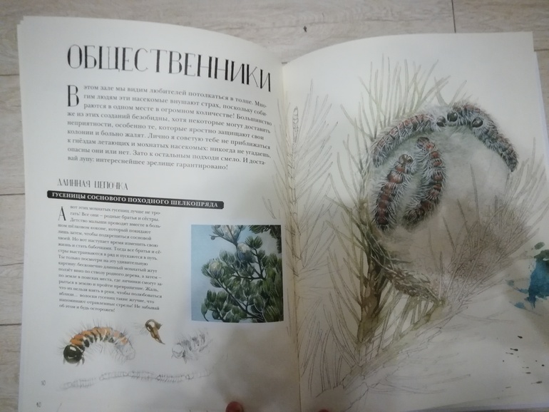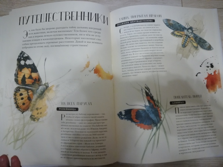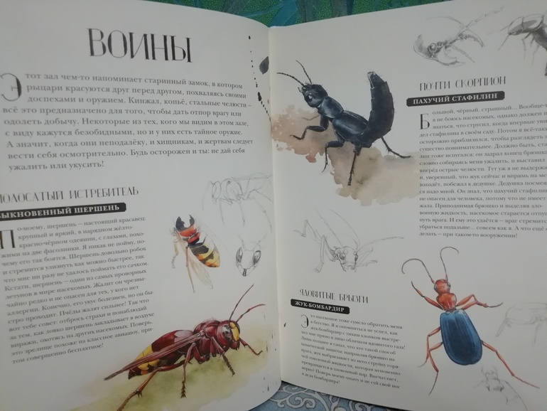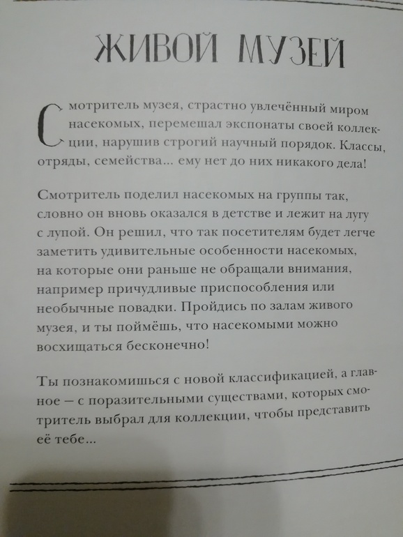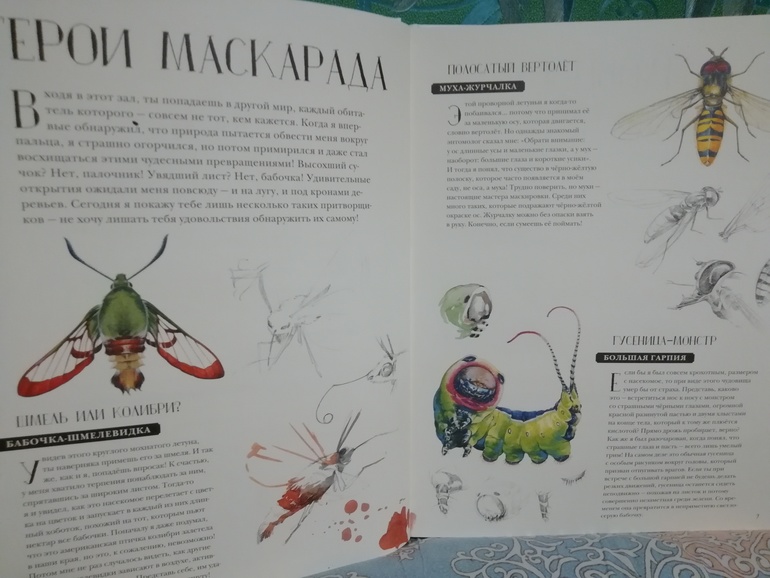 Но не иллюстрациями так интересна книга, как ее содержанием. В музее живых насекомых нам предлагают отправиться, как Вы уже догадались, в музей! И не просто музей, где все насекомые разобраны по видам и подвидам. Это скучно, в этом музее все насекомые перемешаны, Вам не надо запоминать к какому виду и подвиду, группе и т. п. относится данная особь, здесь насекомые разделены по своим особым качествам. Те, кто хорошо маскируются, насекомые-воины, красивые насекомые (конечно же бабочки, куда без них), пловцы, ядовитые особи, круглые, сеть даже съедобные насекомые.
