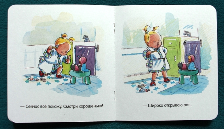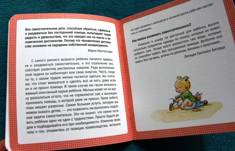 Книжки очаровательно наполнены смыслом. В 2-3 года они учат простым действиям. Даже для мам добавили полезности - отдельный разворот в каждой книжке с советами Монтессори. Советы простые, но об этом надо напоминать родителям почаще.