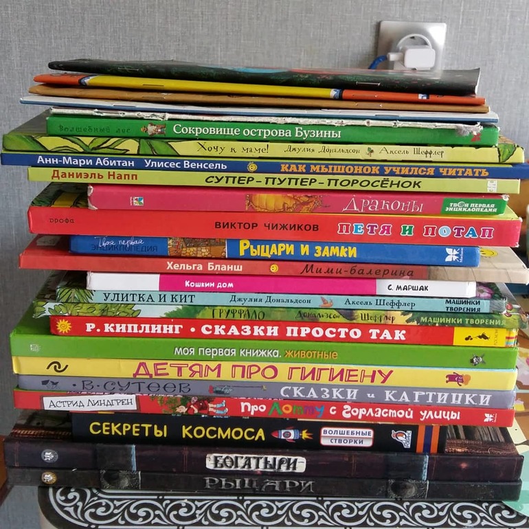 Но как только стало мне лучше я продолжила наше чтение на ночь. Иногда получалось почитать и вечером и днем. И вот такую стопку мы начитали с 12 апреля.