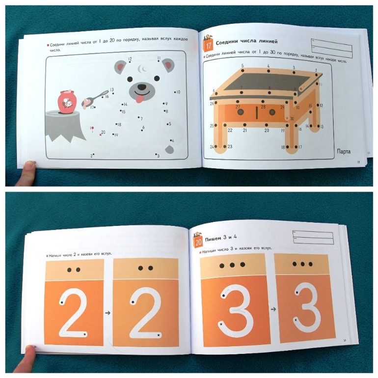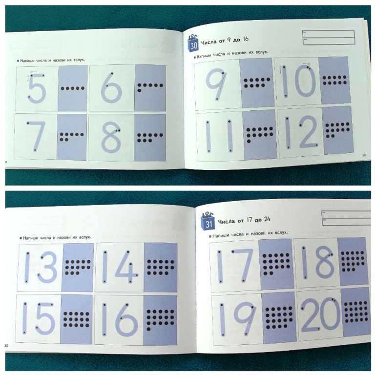 А чуть дальше середины все та же линия предлагает уже обводить цифры. Тут можно параллельно с ребенком считать точки. Тут важно присматривать за ребенком, чтобы обводил в нужном направлении - мы же не только теперь линии проводить учимся, а навык написания цифры закрепится. Цифры повторяются.