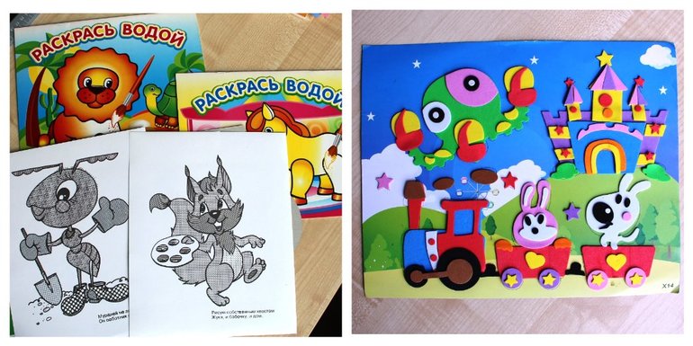 Раскраски водой у нас лежат в этой же стопочке для смены деятельности. Их люблю потому что «чистый» способ рисования, а когда на парте лежит стопочка пособий, мне чистота важна. Тем более, что я параллельно отвлекаюсь на старшего.