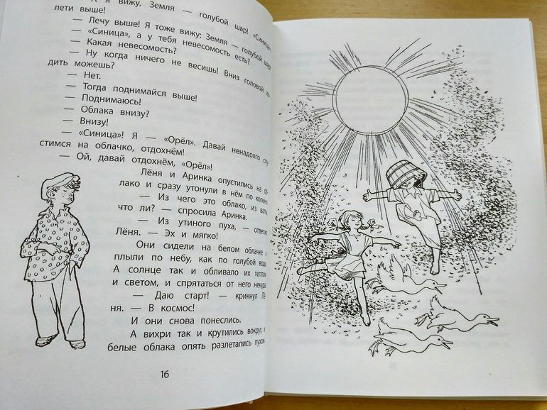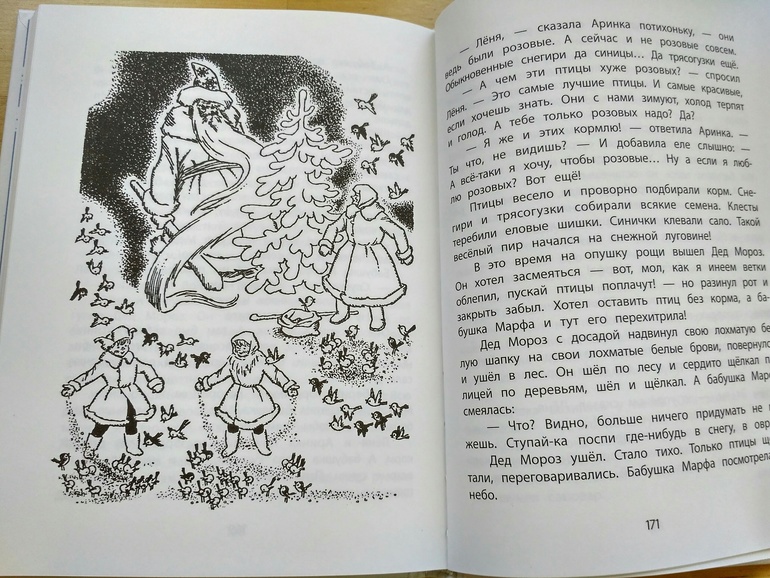 Есть в книге и зимние рассказы, о том как Лёня с Аринкой поехали в другую деревню к бабушке Марфе, и там они ночью воевали с Дедом Морозом, который все вокруг заморозил. Лось не мог воды попить речка вся льдом покрылась. Тогда бабушка, Лёня и Аринка начали клюкой по льду бить, пока прорубь не сделали. Птичкам голодным дети крошек набросали.