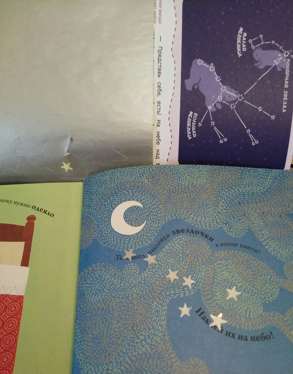 Мы, правда, пока половину сделали. На майские праздники в один чудесный вечер под треск угля в мангале на небе мы с сыном смогли совершенно четко увидеть большую и малую медведиц. Не знаю точно, что увидел Денис, но он всем теперь рассказывает,что тоже он видел) Зато в книге мы подробно рассмотрели, как они выглядят, а благодаря замечательным мишкам, сын точно их запомнит. А я обежала несколько магазинов, и не нашла макарон звездочек, но недолго расстраивалась, потому что вспомнила, что есть у нас замечательная книга, в которой уже готовое небо и звезды, осталось только наметать куда и предложить сыну приклеить