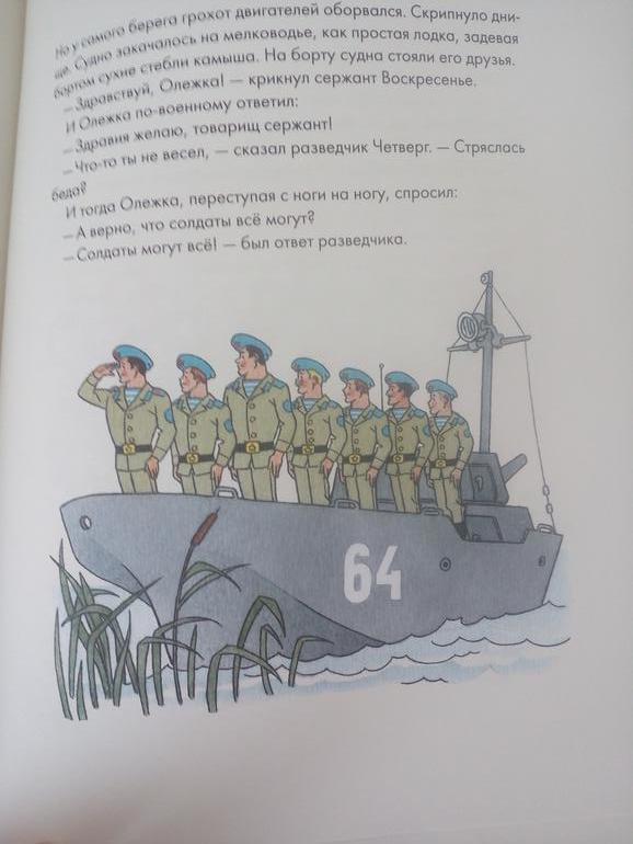 А дальше история становится немного волшебной. В каждом солдате (а зовут их Понедельник, Вторник, Среда, Четверг, Пятница, Суббота, Воскресенье) видит достойный пример. Вместе сними он становится настоящим мальчишкой, Олегом, а не Олей.