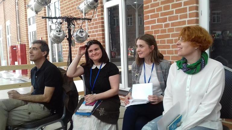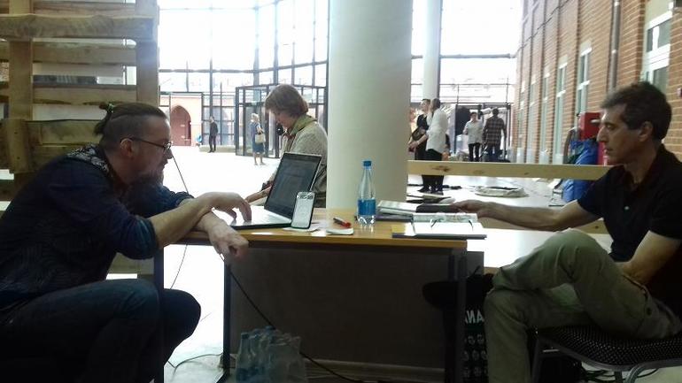 А после Юлии Кузнецовой появилась целая группа товарищей))) На одной площадке собрались Артур Гиваргизов, Наталия Волкова, Юлия Симбирская, Мария Бершадская и Алексей Олейников. И устроили поэтическим слэм. Координатором был Алексей Олейников, писатель, учитель и, как оказалось, тоже поэт)) Сначала все они читали по несколько своих стихов на заданные зрителями темы, потом зрители аплодисментами выбирали лучшего( тут безоговорочно победила Мария Бершадская, у которой не только замечательные стихи, но и потрясающий актерский дар). Потом они опять же читали стихи, подхватывая темы друг у друга. Это было круто! Это были такие "американские горки"! От грусти - до безудержного смеха, от веселья - к отчаянию...Но заканчивалось всегда хохотом и хорошим настроением. Если честно, у меня после этого слэма просто челюсти свело от улыбки во весь рот. А потом они отвечали на вопросы. Кстати, задавали их почти всегда юные слушатели. А среди взрослых оказалось несколько поэтов, которые тоже включились в эту игру. В общем, незабываемое мероприятие! Убегавший с него на поезд Артур Гиваргизов чуть куртку не забыл( видимо, эмоции захлестнули)). А мог бы и забыть. Чтобы еще к нам вернуться))