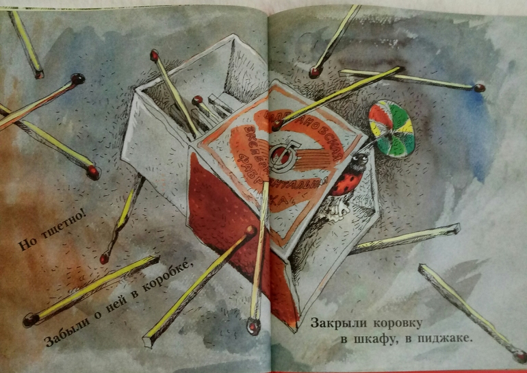 Сюжет стихотворения и правда триллер, счастливо гуляющую божью коровку ловят и прячут в спичечную коробку, но она не сдается и всеми силами пытается выбраться обратно, на свободу.