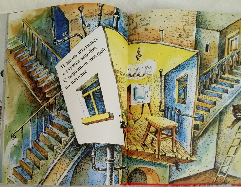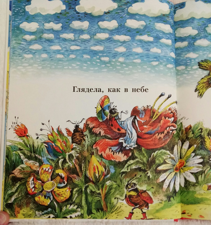 Вот казалось бы такое простой сюжет, а сколько важных тем можно обсудить! И про упорство, и про достижение цели, и про бережное отношение к маленьким насекомым, и не только. Да, я же не сказала, почему вдруг я побежала сломя голову покупать эту книгу, даже забыв о том, что в майшопе на нигму бывают скидки, сейчас вот смотрю, а она дешевле на 50 руб стала, но мне же срочно надо было) ребенок чудесный мультик посмотрел по этому стихотворению, просто сидел разинув рот и выпав из реальности, ну как я могла пропустить книгу при такой реакции) единственно, в мультике есть про деток, жаль, в книжке нет. А еще мне понравилось, что сначала стихотворение идет по строчке на разворот, причем строчки и по горизонтале, и по диагонале, и по вертикале, а потом идет сразу полное стихотворение, иногда так удобнее читать!