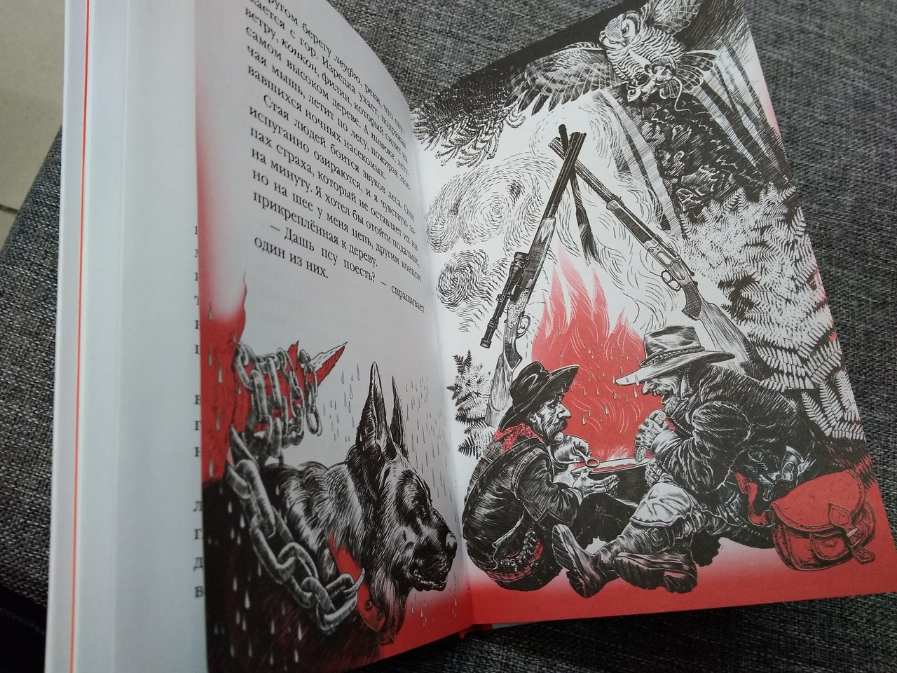 Иллюстраций достаточно, и мне они очень нравятся своей строгостью, четкостью, тревожной черно-красной гаммой, подчеркивающей атмосферу рассказа.