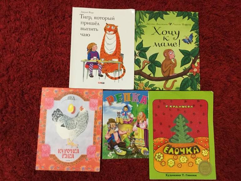 Вот декабрьский набор (1г5мес), мы с дочерью впервые начали рассматривать и читать тонкие книжки, но из моих рук, чтобы не порвать. К январю Ёлочка Кудашевой к счастью перестала быть в таком фаворе, так как от неё я уже просто к тому времени охрипла. Как бы хотелось, чтобы эта книга была бы издана на плотном картоне - она всё-таки ещё для возраста, когда дети нечаянно могут не только порвать, но и сжевать листы. Тигр понравился сразу и любим до сих пор. Курочку Рябу разыгрывали с жёлтым деревянным яичком, но через месяц-другой книжку я отложила - она перестала вызывать интерес.